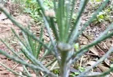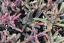 棒叶落地生根是景天科、落地生根属植物。茎直立、粉褐色。叶圆棒形,上表面有沟、粉色,有红褐斑。叶片交互对生,交叉排列成十字形。叶端锯齿上长有很小的幼株、落地后即可生根成活。原产非洲马达加斯加。…全部>>