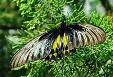 金裳凤蝶是凤蝶科、裳凤蝶属的动物。金裳凤蝶身体呈黑色,头、颈和胸侧有红毛,腹部有黑黄两色相间条纹,雄蝶前翅黑色,具黑天鹅绒光泽,各脉两侧灰白色,后翅金黄色,各室外缘有等腰三角形黑斑1枚,斑内侧有晕,…全部>>
