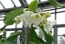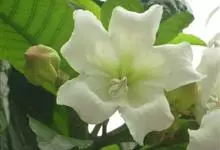 清明花是夹竹桃科、清明花属常绿高大藤本,叶长圆状或倒卵形;聚伞花序顶生,着花3-5朵,有时更多;花大,漏斗形,白色,有香气,花冠5裂片;种子有白色绢质种毛。果期秋冬季。原产云南、印度,…全部>>