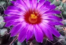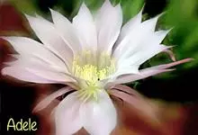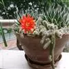 仙人球花 仙人掌科,仙人球属。植株单生或成丛。幼株球形,老株长成圆筒状,高可达75厘米,直径12-15厘米。球体暗绿色,具棱11-12。刺锥状,黑色,长1-1.5厘米。花着生于球体侧方,大型嗽喇叭状…全部>>