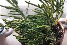 筒叶花月,是景天科青锁龙属的多年生草本植物。植株多分株,灌木状,茎较粗壮,圆柱形,表皮灰褐色;叶片肉质,互生,呈圆筒状,簇生于茎或分枝顶端,叶端呈斜截形,截面为椭圆形;花呈星状,淡白色;花期秋季。…全部>>