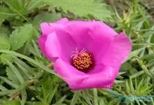 大花马齿苋:一年生草本,高10-30厘米。茎平卧或斜升,紫红色,多分枝,节上丛生毛。叶密集枝端,较下的叶不规则互生,叶片细圆柱形,无毛。花单生或数朵簇生枝端,直径2.5-4厘米,…全部>>