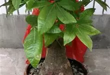 瓜栗 Walp. ),俗称发财树,木棉科小乔木,高4-5米,树冠较松散,幼枝栗褐色,无毛。小叶具短柄或近无柄。花单生枝顶叶腋;花梗粗壮,被黄色星状茸毛,脱落;萼杯状,近革质;花瓣淡黄绿色,狭披针形…全部>>