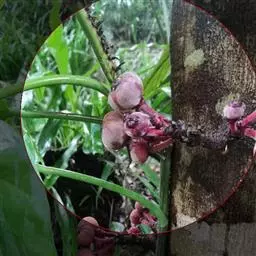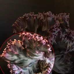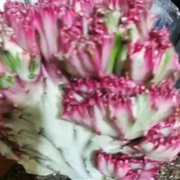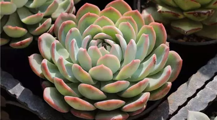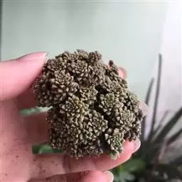 叶子表面宽厚,富肉质感且带有磨纱质感,看像石头质地;开红色小花,生于植株顶部,倒伞形密生,形状像花…