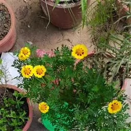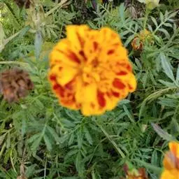 万寿菊是菊科万寿菊属一年生草本植物,别名孔雀菊、缎子花、臭菊花、西番菊、红黄草、小万寿菊、臭芙蓉、孔雀草。万寿菊茎近基部分枝。叶羽状分裂,长5-10厘米,宽4-8厘米,裂片长椭圆形或披针形,具锐齿,上部叶裂片齿端有长细芒,叶缘有少数腺体。头状花序单生,径5-8厘米,花序梗顶端棍棒状。总苞长1.8-2厘米,径1-1.5厘米,杯状,顶端具尖齿。舌状花黄或暗橙黄色,长2.9厘米,舌片倒卵形,长1.4厘米,基部成长爪,先端微弯缺。管状花花冠黄色,长约9毫米,冠檐5齿裂。瘦果线形,被微毛;冠毛有1-2长芒和2-3短而钝鳞片。花期7-9月。万寿菊中国各地均有栽培,在广东和云南南部、东南部已归化,国外原产墨西哥。万寿菊对土壤要求不严,但以肥沃疏松排水良好的土壤为好。耐移栽,种子发芽适温21-24℃,植株生长适合温度为20-29℃。喜温暖和阳光充足的环境,不